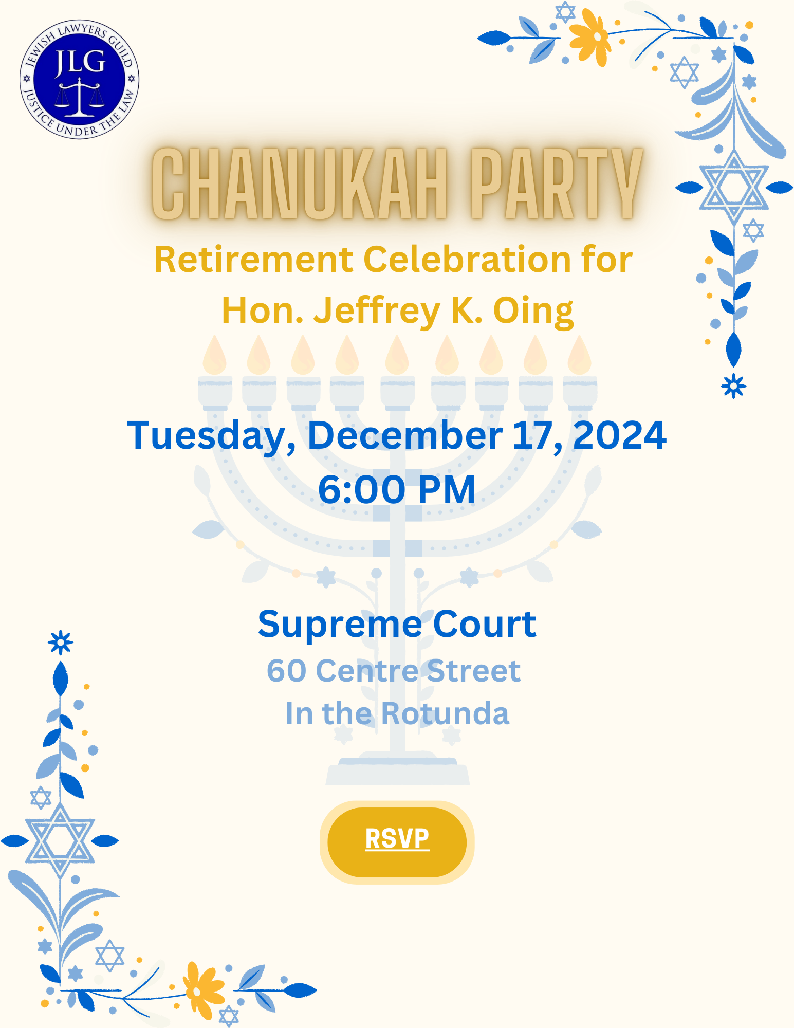 Annual Chanukah party & Retirement Celebration for Hon. Jeffrey K. Oing, Associate Justice of the Appellate Division, First Department, member of our Board of Governors and past recipient of our Golda Meir Memorial Award