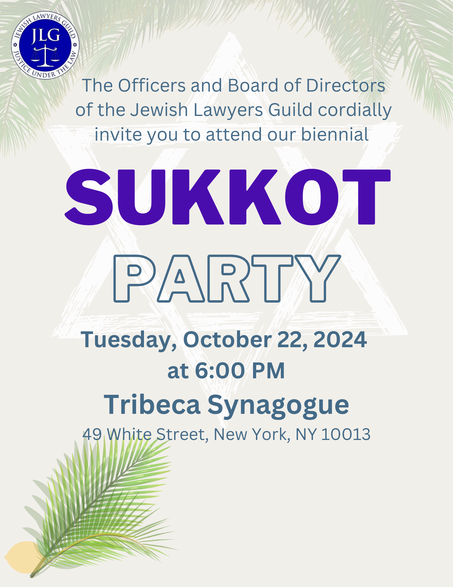 Sukkot marks the time for payment of annual JLG dues, which can be paid via our website: www.jewishlawyersguild.org or by sending a check made payable to The Jewish Lawyers Guild to the address below: